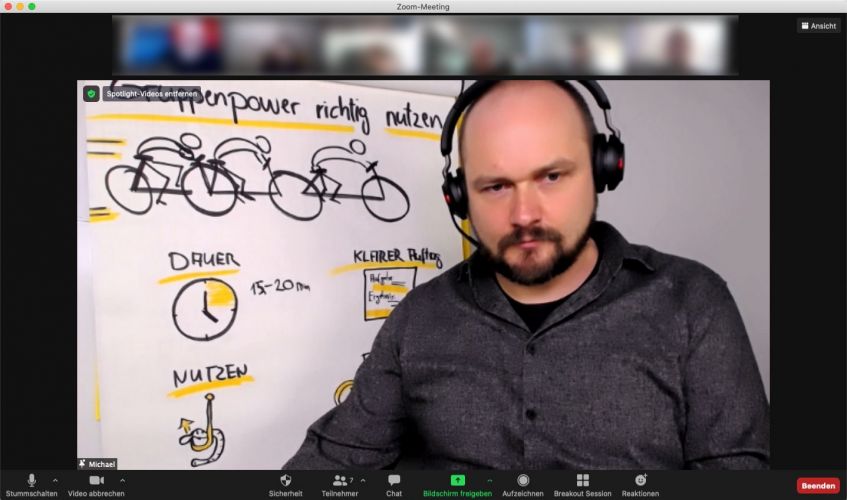 Michael Ziereis beim Online-Training vor großformatigen Pinnwand-Postern